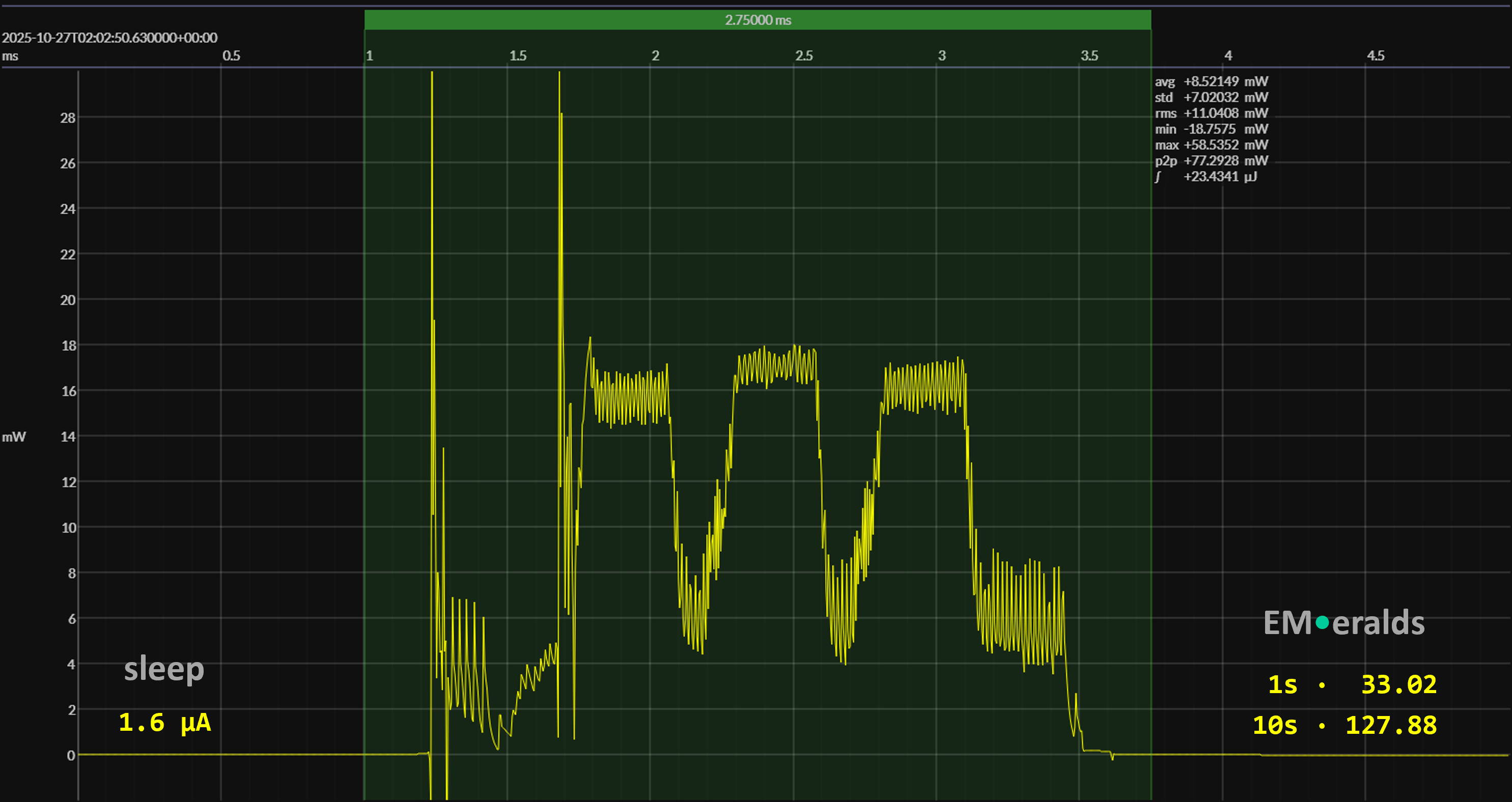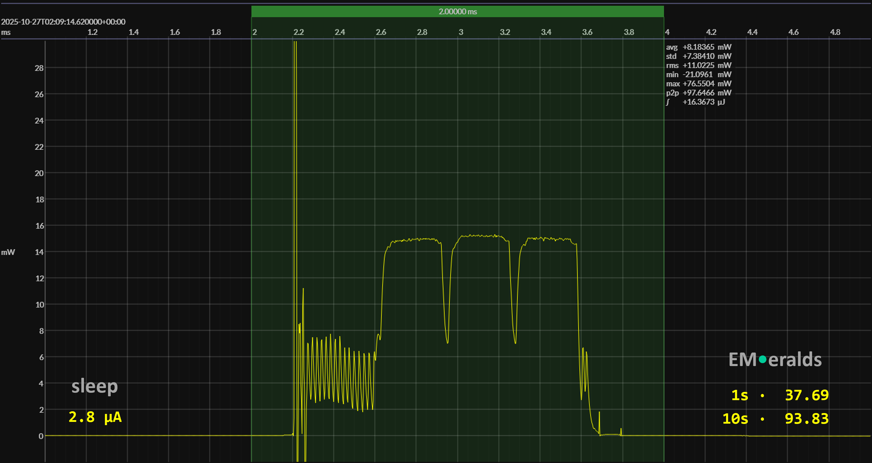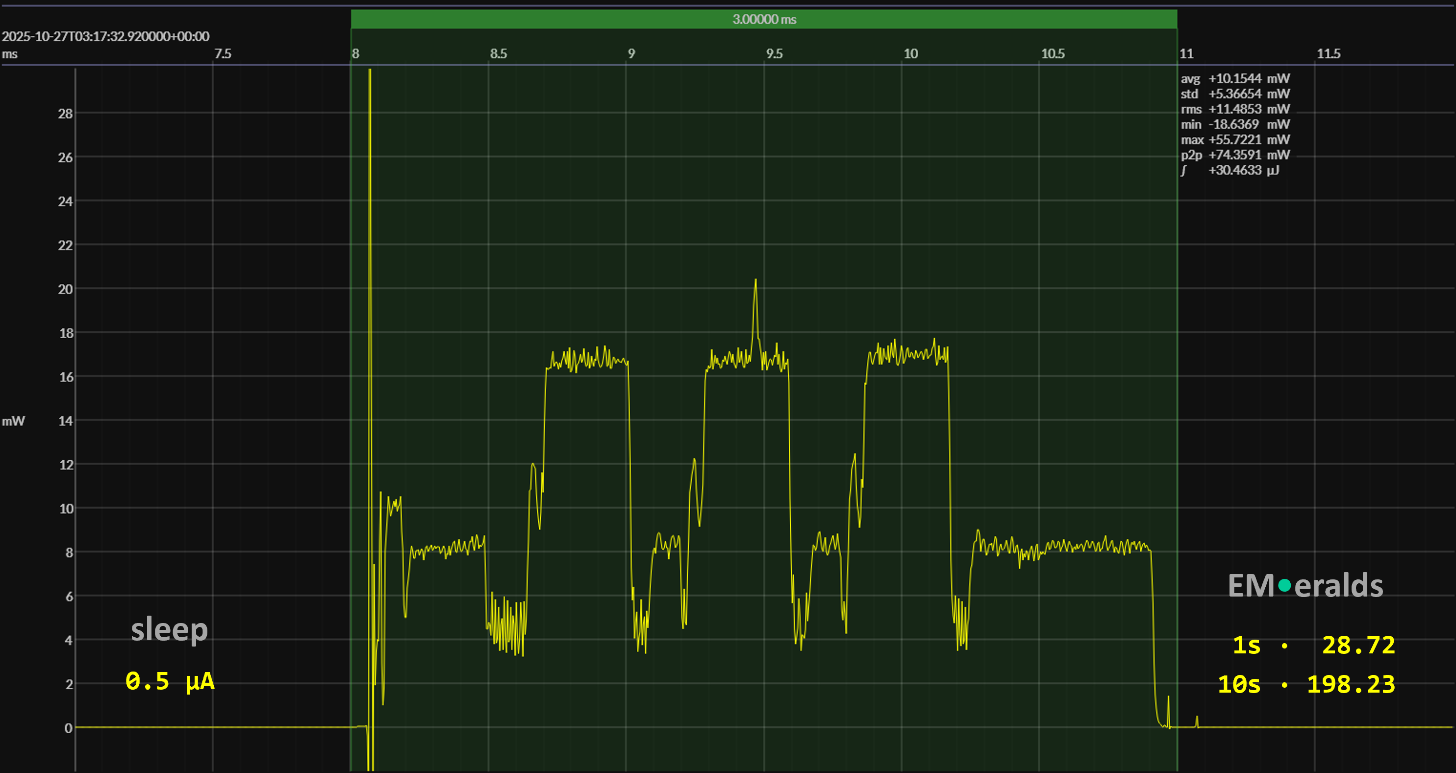 Sleep current in fact dominates as we increase our event period from one-second to ten-seconds. After measuring sleep current as well as energy consumption of a typical event, EM•Scope can extrapolate EM•erald scores for any period of interest to our application.